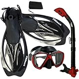 PROMATE Snorkeling Scuba Dive Dry Snorkel New Fish-Eye Mask Fins Gear Set, Black Red, S/M (Misc.)