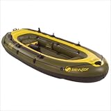 The Sevylor Fish Hunter Inflatable Boat is packed with features for performance and convenience, so you can focus on fishing. Measuring 11 Feet9 Inch long by 5 Feet7 Inch wide, the 6-Person Fish hunter holds up to 1,200 pounds and is durably constructed of heavy-duty 32-gauge PVC. The Fish Hunter is built with two tunnel chambers for lateral stability on the water. For comfort, the Fish Hunter features two inflatable seats, two fishing-rod holders, four swivel oarlocks, and chafing pads. Drain plugs make it easy to empty out water, while an all-around grabline and built-in carry handles offer convenience. The Fish Hunter includes bow and stern fittings for an electric motor, with optional fittings for a 2.5HP motor. A handy gear bag and battery pouch are included. Guaranteed not to leak, thanks to Sevylor Feets exclusive Airtight System, the boat Feets Double-Lock Valves prevent accidental air loss and ensure quick, easy inflation and deflation. NMMA certified. Read more