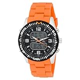 Causal but fashionable mens strap watch with orange rubber band and buckle closure. Featuring round case, black dial with both Arabic numerals display and digital display, orange second hand. The digital dial shows you the calandar in day, month and date. It is also with EL backlight, alarm, timer functions. Black rotating bezel with markers. Read more
