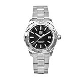 Stainless steel case and bracelet. Unidirectional rotating stainless steel bezel. Black dial with silver-tone hands and index hour markers. Minute markers around the outer rim. Luminescent hands and markers. Date display at the 3 o'clock position. Quartz movement. Scratch resistant sapphire crystal. Textured steel crown. Case diameter: 40 mm. Case thickness: 10.5 mm. Push button fold over clasp. Water resistant at 300 meters / 1000 feet. Functions: hours, minutes, seconds, calendar. Tag Heuer Aquaracer Stainless Steel Men's Watch WAP1110BA0831. Read more
